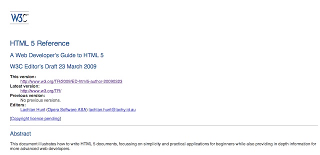 The official W3C (World Wide Web Consortium – the fancy-sounding organization) guide to HTML5. More specifically, it shows how to write simple and practical HTML5 documents and web applications. It also offers in-depth information for the advanced folks out there who are into that kind of stuff.