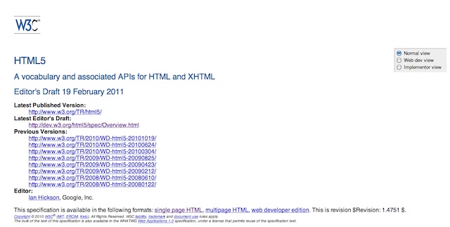 The official W3C HTML5 spec webpage. Definitely not for reading, but if you need anything and everything for looking up the particulars of HTML5, some aspect of it, how to use it, and so forth, this the really long better-use-that-web-browser-search-engine guide for you.