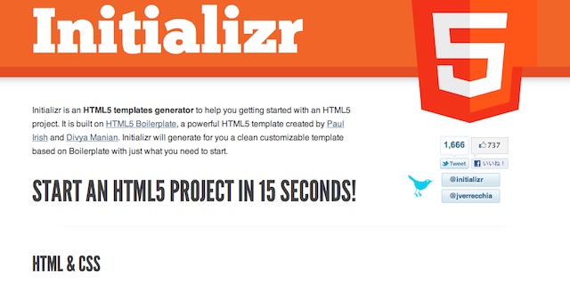 Initializr is an HTML5 templates generator that helps you get started with your HTML5 project. It does that by generating a clean customizable template with just what you need to start. Initializr is based on the HTML5 Boilerplate template.